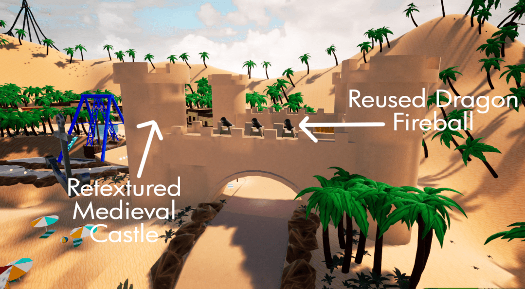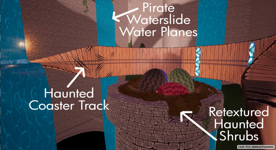 - The medieval track was the last to reach alpha ready meaning much of its visual identity and storytelling had to be cleverly constructed from elements from the previous two tracks such as the decimated dragon coaster as well as the castle interiors.