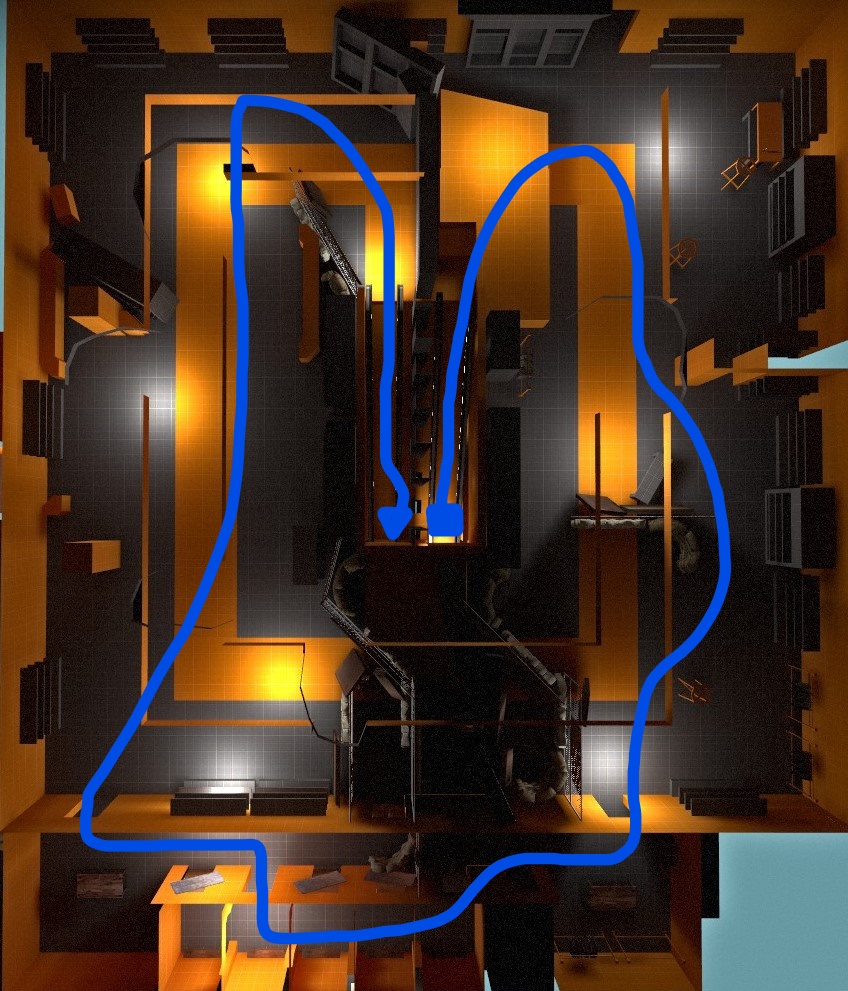 - While the flow in the bottom two floors of the level changed the top floor’s critical path largely stayed the same from design to release