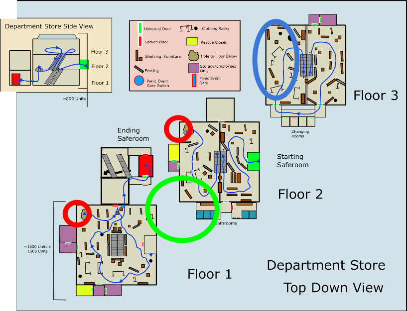 - Department Stores are large open squares requiring clever sight and path blocking to enable satisfying infected spawning, create interesting flow while also contributing to a realistic environment