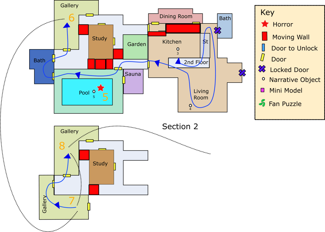 - The first version of the sequence required players to walk through the same room 5 times before progress was unblocked but the changes in the room were too subtle to let players know they were progressing